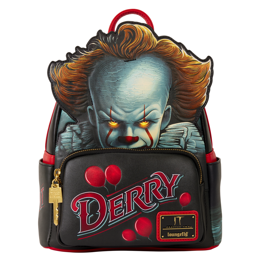 This mini backpack features your favorite shapeshifting dancing clown, Pennywise! He creeps over the front pocket, which says "DERRY." Pennywise's eyes light up for an extra scare. On the side pockets, you'll find an illustration of Georgie's boat and the phrase, "Time to Float."