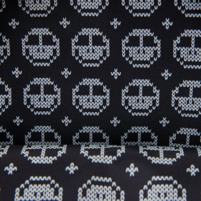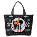 This tote features art inspired by a holiday sweater. You'll find bats, zig zag designs, and "Pumpkin King" written on the back. On the front, you'll find Jack Skellington's face made of sequins. The sequins are reversible, so the image swaps to a jack-o'-lantern! The coin bag attached to the crossbody strap matches the artwork of Jack on the bag and swaps between him and a jack-o'-lantern, too!